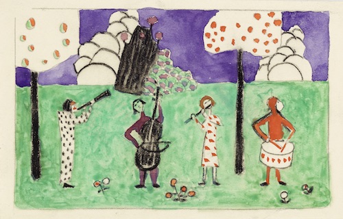 En 1912, Vassily Kandinsky publie avec le peintre Franz Marc, l’Almanach du Blaue Reiter (Cavalier bleu). Véritable manifeste pour un art total où fusionnent toutes les formes de créations, l’Almanach réunit des reproductions de peintures anciennes et modernes, des icônes russes, des dessins d’enfants, des œuvres d’art populaire et des partitions de Schönberg, Webern, Berg.