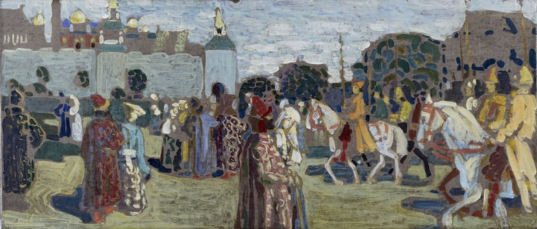 ☞ Kandinsky se destinait à une carrière juridique mais à trente ans, il décide de devenir peintre. Ce tournant, raconte-t-il dans son autobiographie Regards sur le passé, serait lié à deux expériences vécues en 1896 : l’émotion éprouvée devant l’une des Meules de foin de Monet présentée à Moscou et la découverte de l’opéra Lohengrin de Wagner au théâtre du Bolchoï. Ses premiers tableaux puisent leur inspiration dans l’art populaire russe. Toute sa vie, Moscou restera sa patrie spirituelle et visuelle.